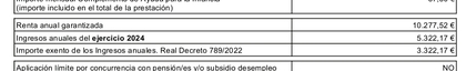 El IMV siempre es la renta garantizada (en tu caso, un adulto más un menor, que son 10277,52€ anuales) MENOS ingresos imputables del año pasado (te imputan 5322,17€ que deben coincidirte con tu IRPF 2024) MÁS posible bonificación por incentivo al empleo (en este caso 3322,17€ que es el incremento de ingresos por trabajo entre IRPF 2024 menos los del IRPF 2023) lo que arroja un total de 10277,52 - 5322,17 + 3322,17 = 10077,52 euros anuales, entre doce son 839,79 de IMV más aparte el CAPI que irá en función del menor (el cual desconozco datos e importe porque lo has tapado) ... revisa si te coincide