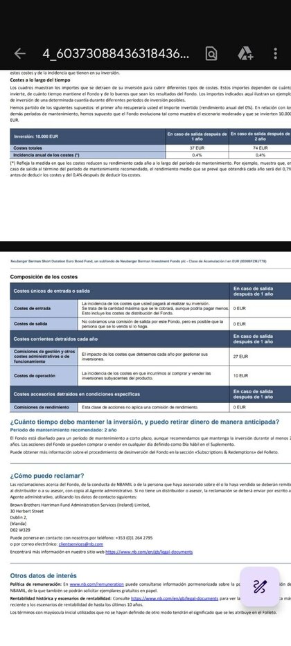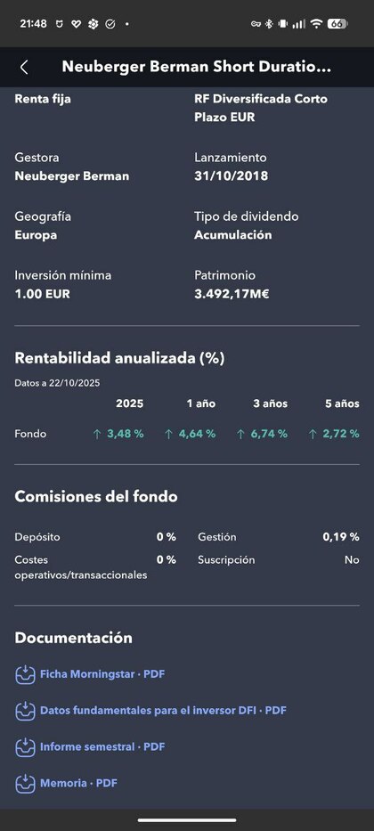 Mi idea es una inversión con un riesgo bastante bajito para empezar y he visto que en MyInvestor se puede meter dinero en Neuberger Berman Short Duration Euro Bond Fund (IE00BFZMJT78).